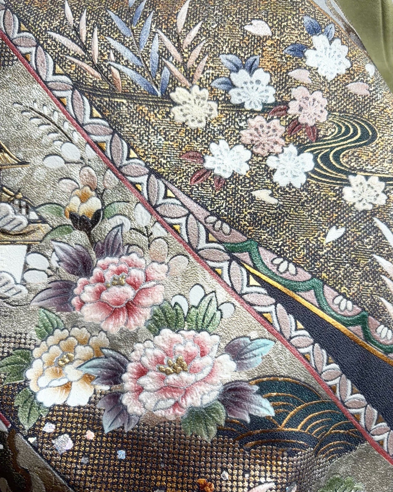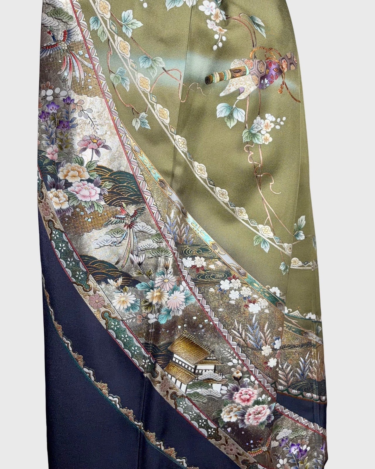 着物の裾部分を贅沢に使用した、柄の技巧や魅力を堪能できるスカートです。